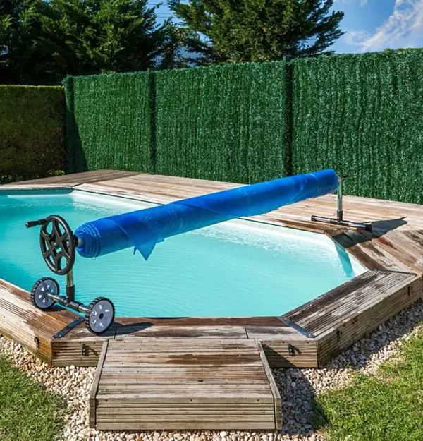 Den teleskopiska upprullaren för nedsänkta pooler gör hantering och insamling av sommaröverdrag enkelt. Med en maximal bredd på 550 cm är den idealisk för ovala, runda eller fyrkantiga nedsänkta pooler. Upprullaren är utrustad med breda hjul för enkel förflyttning och ett ergonomiskt hjul med vridknapp för extra komfort under användning. Paketet innehåller runda anodiserade aluminiumrör och ett kit för att säkert fästa överdraget på upprullaren, vilket säkerställer en smidig och effektiv användning.